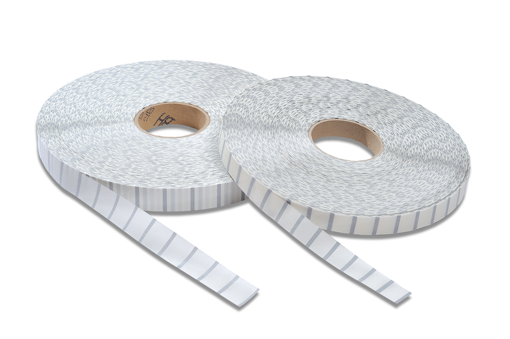 Die Klebepunkte sind transparent mit Perforation längs der Bahn, leicht öffnend durch Kerbe am Rand, schwarzer Trennbalken, rund, Durchmesser 25 mm, Kerndurchmesser 76 mm, permanent klebend.